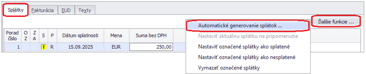 Ostatné mesačné splátky vieme vytvoriť kópiou z prvej mesačnej splátky, a to v záložke Splátky pomocou tlačidla Ďalšie funkcie – Automatické generovanie splátok.