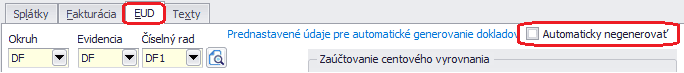 V dolnej časti v záložke Fakturácia zapneme voľbu Automaticky negenerovať, pretože ide o záväzky, z ktorých sa budú generovať iba doklady do Evidencie účtovných dokladov.