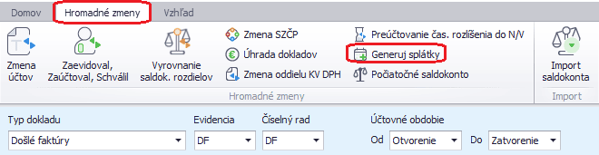 Jednotlivé faktúry môžeme každý mesiac generovať použitím automatickej funkcie v Evidencii účtovných dokladov cez záložku Hromadné zmeny – Generuj splátky.
