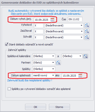 Dátum vyhotovenia/prijatia zadáme tak, aby dátum splatnosti na splátke bol vyšší, nakoľko splatnosť faktúry musí byť vyššia ako dátum vyhotovenia/prijatia faktúry.