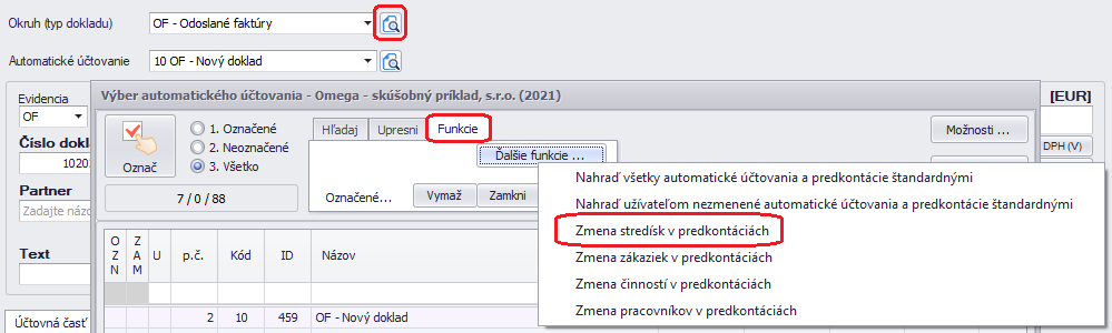 - Vo formulári Výber predkontácie zvolíme záložku Funkcie a cez Ďalšie funkcie klikneme na voľbu Zmena stredísk (zákaziek, činností, pracovníkov) v predkontáciách.