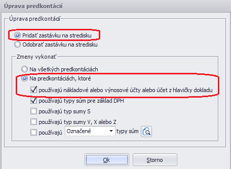- V hornej časti formulára Úprava predkontácii určíme pridanie zastávky a v spodnej časti nastavíme zastávku, napríklad pri použití nákladových alebo výnosových účtov na doklade.