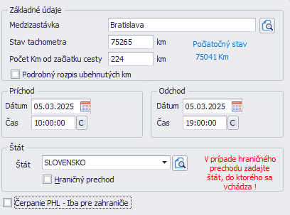 Uvedené čerpanie PHL slúži len pre čerpanie v zahraničí a pri použití služobného vozidla. Čerpanie PHL v Slovenskej republike vypĺňame v záložke Jazda.