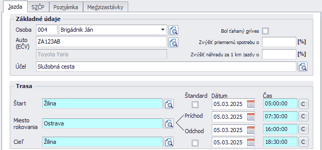 V časti Medzizastávky zaevidujeme hraničný prechod Makov ako 1. medzizastávku. V základných údajoch doplníme Stav tachometra pri príchode do miesta medzizastávky a celkový počet ubehnutých kilometrov od začiatku jazdy.