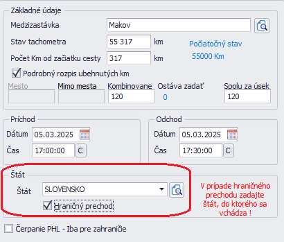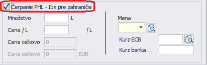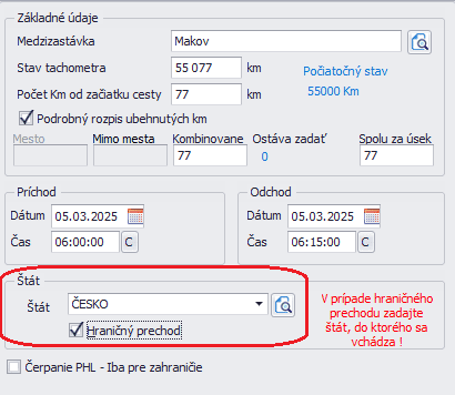 Štát zvolíme Česko, ale políčko Hraničný prechod už nebudeme zaklikávať. V zahraničí sme čerpali PHL, toto čerpanie zadáme v spodnej časti formulára.