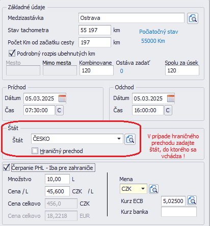 Dňa 5. 3. 2025 sme vycestovali na služobnú cestu služobným autom zo Žiliny do Ostravy. Prechádzali sme cez hraničný prechod Makov. Ako zaevidujeme zahraničnú jazdu?