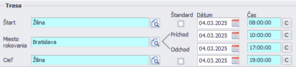 Najskôr si vyplníme požadované údaje Štart, Miesto rokovania, Cieľ, dátumy a časy.