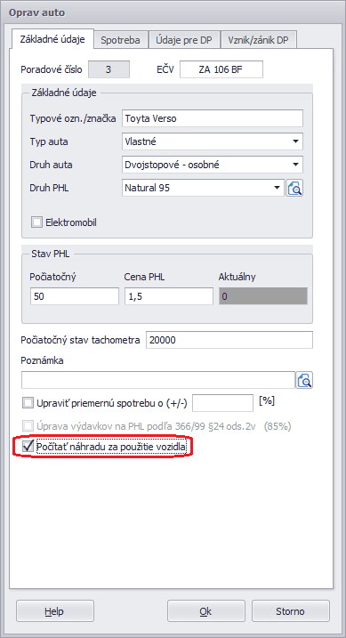 Pre výpočet paušálnej náhrady za pri vlastnom motorovom vozidle je potrebné mať zapnutú voľbu Počítať náhradu za použitie vozidla, ktorú nájdeme v menu: Číselník – Autá – Základné údaje.