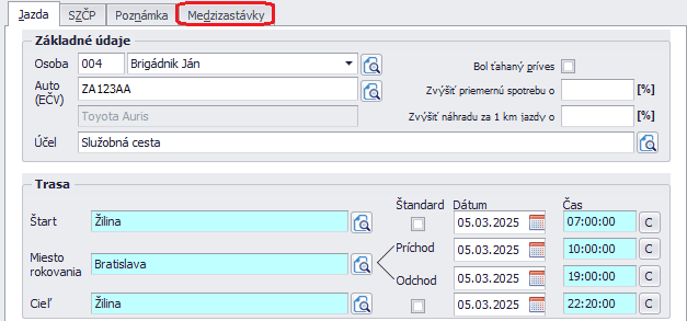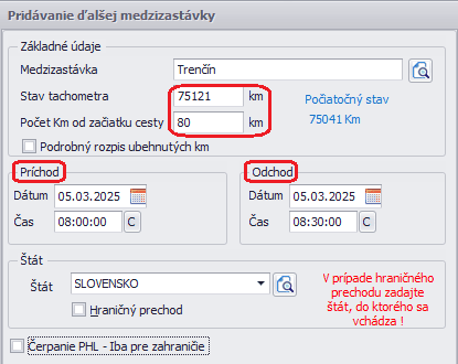 Do zahraničnej jazdy pridávame taktiež jednotlivé medzizastávky. Tieto medzizastávky sú zároveň aj hraničnými prechodmi. Všetky povinné údaje vypĺňame rovnako ako pri tuzemskej jazde.