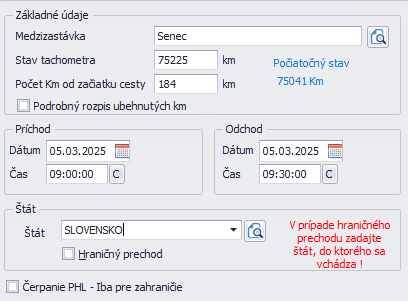 Doplníme názov Medzizastávky. Stav tachometra pri príchode do miesta medzizastávky a celkový počet kilometrov od začiatku cesty. V časti Príchod a Odchod zadáme údaje o dátume a čase príchodu a odchodu. V časti Čerpanie PHL – iba zahraničie vypĺňame údaje pre služobné vozidlo, iba ak ide o zahraničnú cestu.