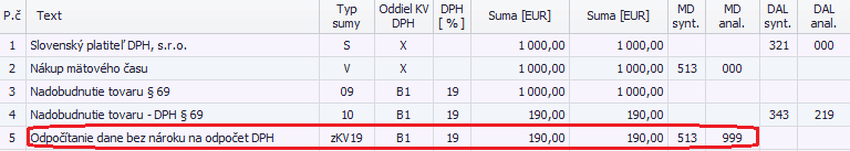 Keďže nemáme nárok na odpočet DPH, vymažeme posledné dva riadky účtovného zápisu, ktoré definujú právo na odpočítanie dane a namiesto toho ručne zaúčtujeme hodnotu odpočtu DPH s typom sumy zKV19 na samostatný nákladový účet 513.xxx, ktorý si nastavíme v menu Číselník – Účtový rozvrh ako nedaňový.