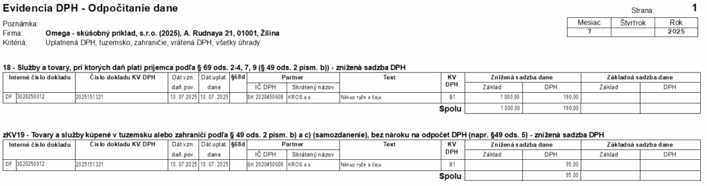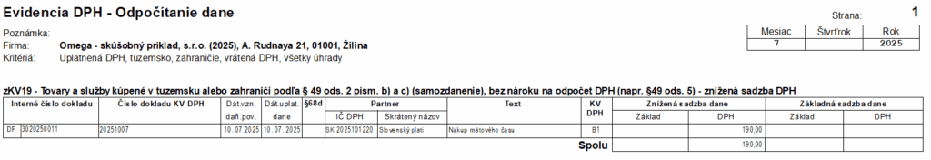 Napriek tomu, že v doklade neodpočítavame DPH, doklad bude uvedený v záznamovej evidencii DPH, v programe sa jedná o zostavu Evidencia DPH – odpočítanie dane. Typ sumy zKV19 zabezpečí, že sa doklad zobrazí správne v Kontrolnom výkaze, a zároveň aj v Evidencii DPH – odpočítanie dane.