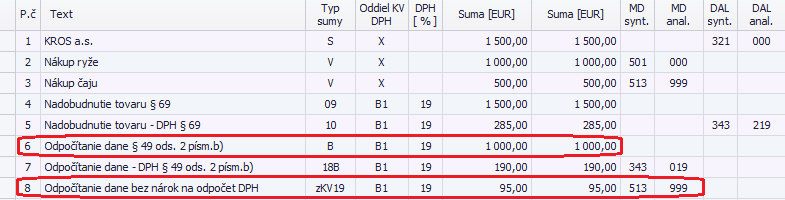 Nakoľko nemáme nárok na plný odpočet DPH, ručne upravíme sumu v 7. riadku pri type sumy 18B. Ponecháme tam len hodnotu DPH, ktorú si môžeme odpočítať a ručne vytvoríme 8. účtovný zápis, kde zapíšeme hodnotu DPH, ktorú si odpočítavať nebudeme. Použijeme typ sumy zKV19 a sumu zaúčtujeme na nákladový nedaňový účet.