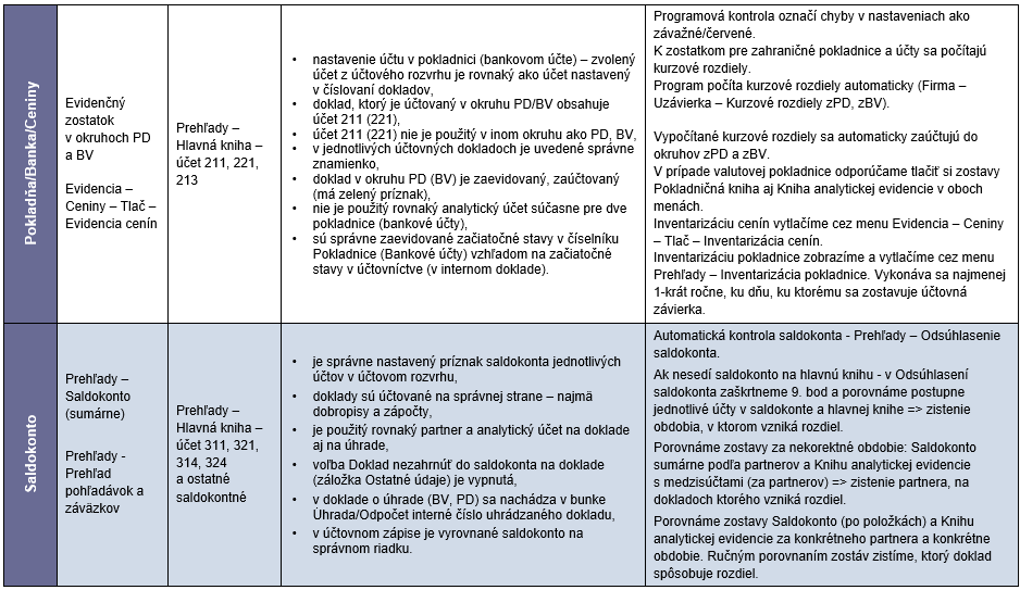 - Kontrola začiatočných stavov a saldokonta v období Otvorenie: Prehľady – Hlavná kniha, Prehľady – Saldokonto sumárne