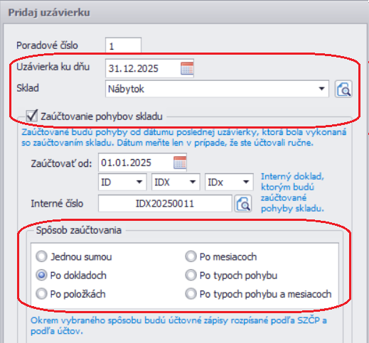 - Uzávierka ku dňu: dopĺňa sa dátum, ku ktorému sa uzatvára sklad.