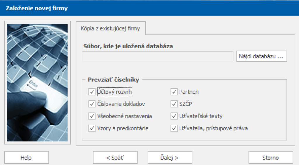 Ak databáza pre firmu, ktorú chcete účtovať, ešte neexistuje, musíte ju najskôr vytvoriť.