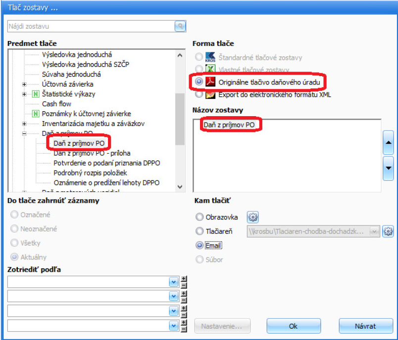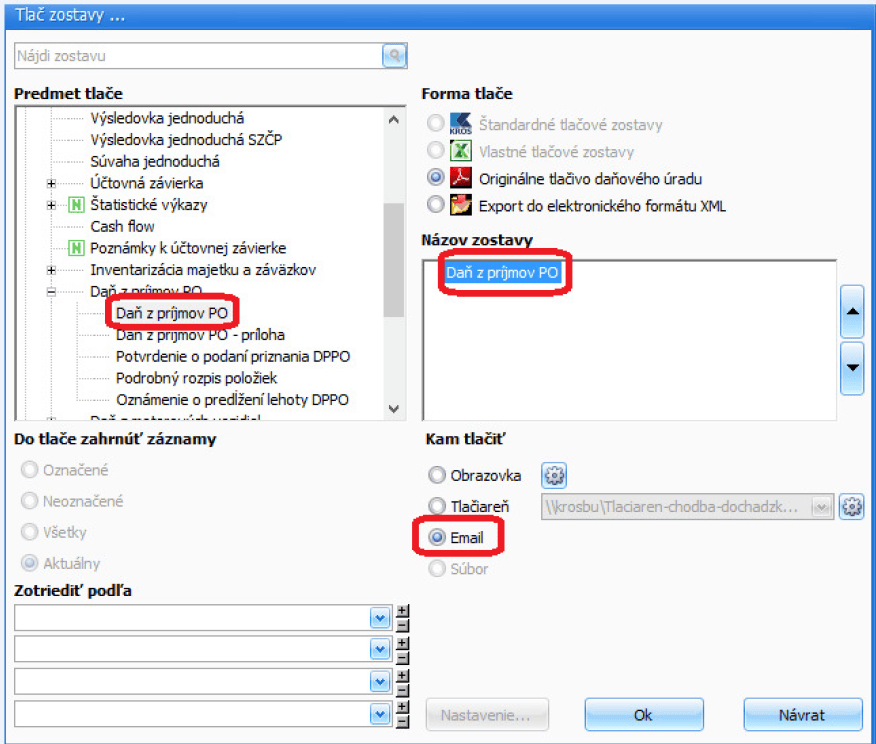 a.) Cez menu Prehľady – Daň z príjmov PO si zobrazíme zostavu Daň z príjmov PO. Cez voľbu Tlač sa dostaneme do formulára Tlač zostavy, kde si v ľavej časti vyberieme Predmet tlače Daň z príjmov PO, v pravej časti Formu tlače Originálne tlačivo daňového úradu a následne Kam tlačiť – Email. Formulár potvrdíme tlačidlom OK.