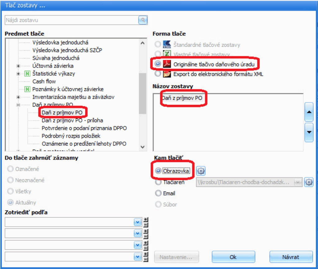 a.) Daňové priznanie si zobrazíme na obrazovke cez menu Prehľady – Daň z príjmov PO. V otvorenom daňovom priznaní je potrebné zvoliť voľbu Tlač a vybrať zostavu Daň z príjmov PO. Následne zvolíme Formu tlače Originálne tlačivo daňového úradu, vyberieme Kam tlačiť na Obrazovku a formulár potvrdíte tlačidlom OK.