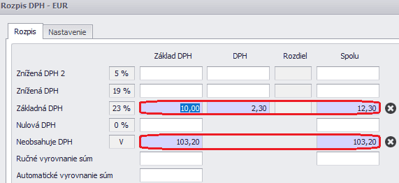 V Rozpise DPH zadáme do bunky Vyššia DPH sumu spracovateľského poplatku 12,30 eur s DPH a do bunky Neobsahuje DPH zadáme colný dlh vo výške 103,20 eura (13,40 eura + 89,80 eura).