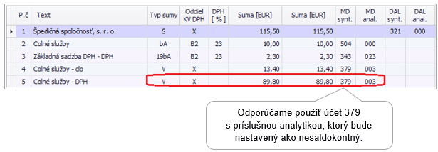 Špedičná spoločnosť, platiteľ DPH, poslala inému slovenskému podnikateľovi, platiteľovi DPH, ktorý účtuje zásoby spôsobom B, potvrdenie o úhrade colného dlhu (colný dlh bol na účet colnice uhradený 9. 7. 2025). Dňa 11. 7. 2025 obdržal podnikateľ potvrdený colný doklad. Po ukončení colného konania sa ukázalo, že do základu dane pri dovoze tovaru nebola zahrnutá hodnota služieb vzťahujúcich sa na dovážaný tovar, ktorých poskytnutie nebolo možné pri určení základu dane predvídať. Poskytnutie týchto služieb preto fakturuje špedičná spoločnosť dňa 1. 8. 2025 samostatne v sume 12,30 eur s DPH. Celková suma faktúry je 115,50 eura s DPH. Poplatok za spracovanie: 12,30 eur s DPH. Colný dlh – clo: 13,40 eura, DPH: 89,80 eura.