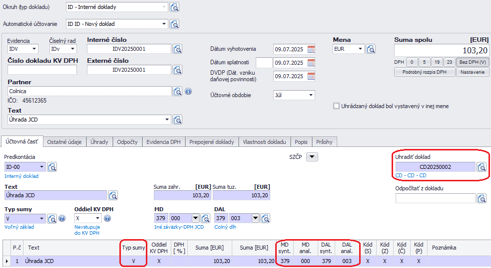 Colný dlh uhradíme pomocou interného dokladu, ktorý zaevidujemeautomatickým účtovaním ID – Nový doklad.
