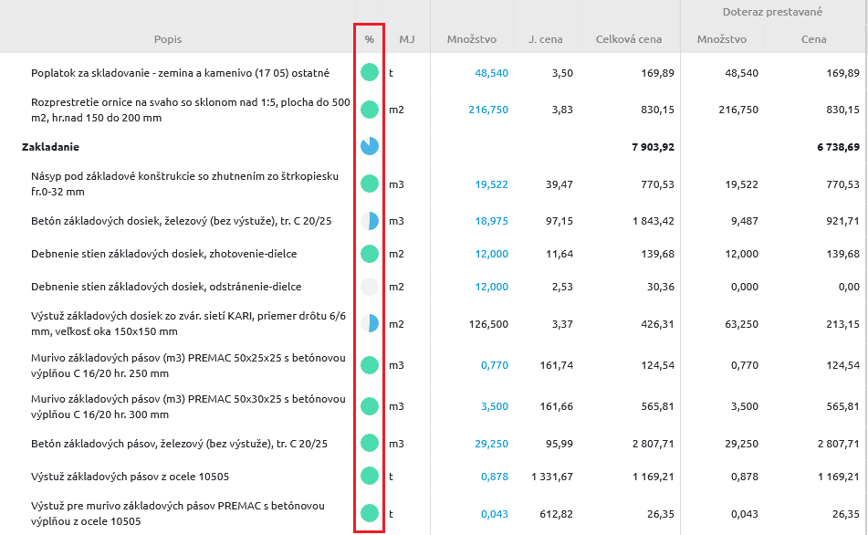 Percento čerpania je graficky znázornené aj v stĺpci za popisom. Rôzne stavy čerpania sú navyše farebne odlíšené: