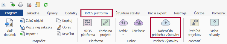 Rozpočet, ktorý máte vytvorený v programe Rozpočty a kalkulácie CENKROS 4, nahráte do Priebehu výstavby tak, že vyberiete stavbu v Zozname zákaziek a použijete funkciu v záložke Kros platforma – Nahrať do priebehu výstavby.