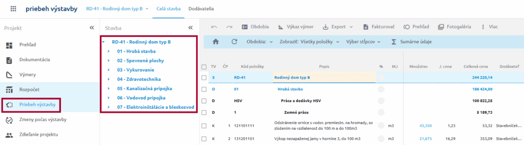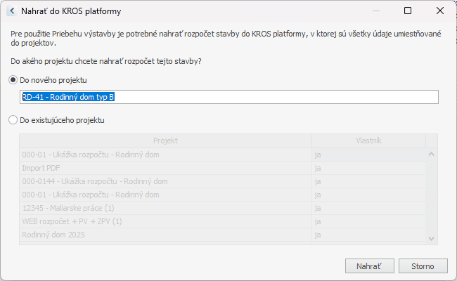 Po kliknutí na Nahrať alebo Áno, prepísať rozpočet, Vás presmeruje do KROS Platformy a položky rozpočtu sa Vám prenesú do Priebehu výstavby na platforme.