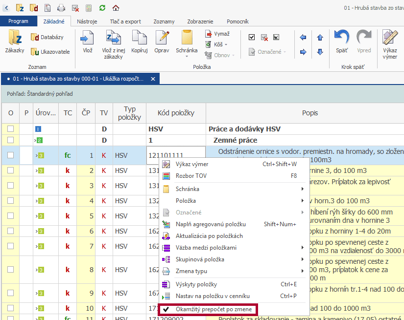 Tento prepočet vypnete stlačením pravého tlačidla myši na akejkoľvek položke a zrušením označenia Okamžitý prepočet po zmene.