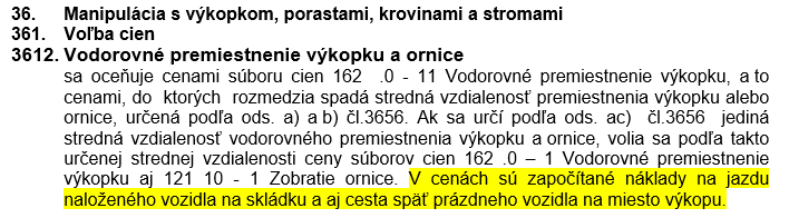 UPOZORNENIE: Pravidlo započítania cesty späť prázdneho nákladného vozidla platí aj pre technologicky príbuzné položky prác vodorovné premiestnenie konárov, kmeňov, krovín alebo sutiny na skládku.