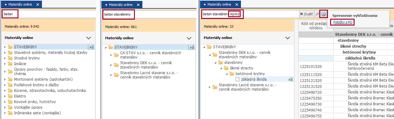Cenníky obsahujú navyše doplnkové informácie o položke, v niektorých prípadoch aj obrázok materiálu a dostupnosť materiálu u konkrétneho predajcu