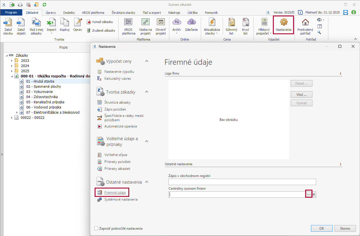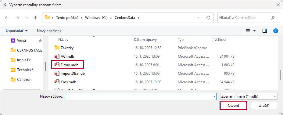 Pozor! Po nahradení súboru Kros.mdb je potrebné znova pripojiť súbor Firmy.mdb, ktorý obsahuje vašu databázu firiem. V Zozname zákaziek otvorte okno Nastavenia. V ľavej časti vyberte Firemné údaje a cez „…“ nájdite a pripojte súbor Firmy.mdb,ktorý sa nachádza v hlavnom adresári programu.