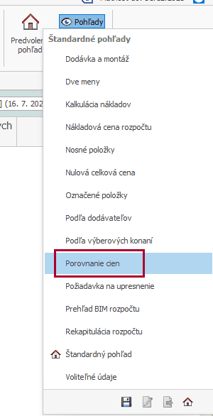 Postup: v pravej hornej časti programu spustíme funkciu Pohľady a z predvolených pohľadov vyberieme Porovnanie cien. V hornej lište programu sa nám otvorí nová záložka Porovnanie cien.