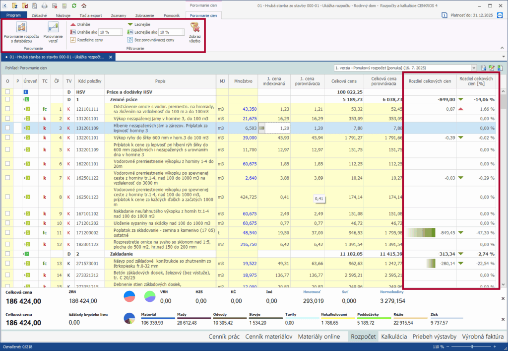 Pomocou tejto funkcie môžete porovnávať položky aktuálne zobrazeného rozpočtu s cenníkovou databázou alebo verziou rozpočtu inej zákazky či kalkulácie. Spustením funkcie sa zobrazí stĺpec jednotková cena porovnávacia, dopočíta sa celková cena a následne zobrazí stĺpec rozdiel celkových cien aj v grafickom prevedení.