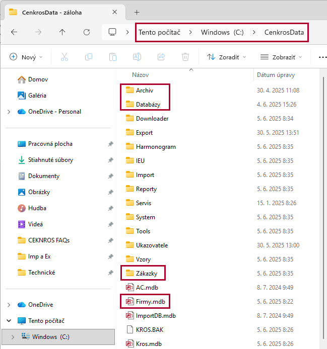 Okrem Zákaziek viete preniesť do nového počítača aj ďalšie dôležité dáta ako napríklad Stavby v Archíve, Databázy, alebo Centrálny zoznam firiem. Všetky tieto údaje sa nachádzajú štandardne na C:\CenkrosData.