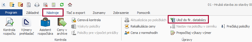 Ak ste do rozpočtu vkladali nové položky, ktoré nie sú obsiahnuté v cenníkoch alebo ste nacenili zadanie od investora s jeho vlástnými R-položkami a chceli by ste si tieto položky spolu s cenami preniesť do vlastnej cenníkovej databázy, môžete využiť funkciu Ulož do firemnej databázy. Tá je dostupná zo záložky Nástroje, ktorá je dostupná v module Rozpočet a kalkulácia. Funkciu tiež spustíte stlačením klávesovej skratky Ctrl+G.