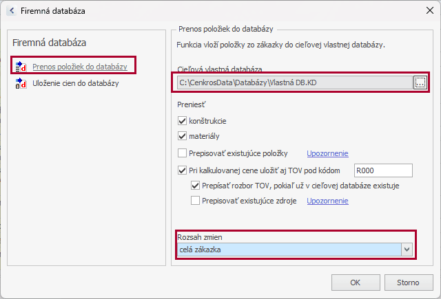 Funkcia prenesie zo zákazky do vlastnej databázy všetky alebo len označené položky. Môžete taktiež zvoliť či chcete preniesť aj rozbor TOV, alebo chcete preniesť len položky materiálov.