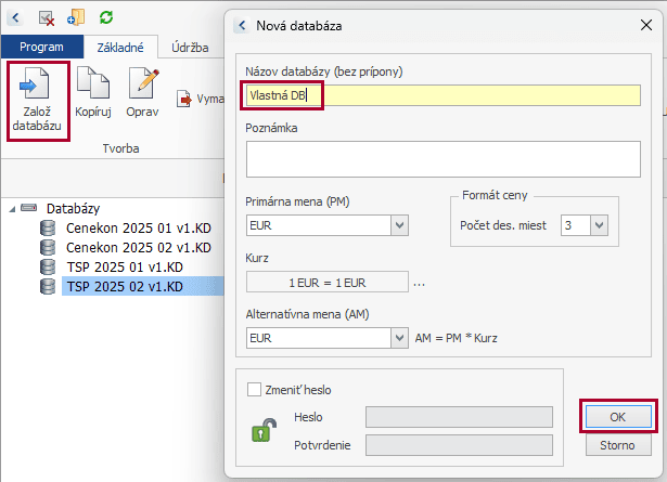 UPOZORNENIE: Ak nemáte vytvorenú vlastnú databázu, je potrebné ju založiť. Vlastnú databázu si vytvoríte v Zozname databáz pomocou funkcie Založ databázu.