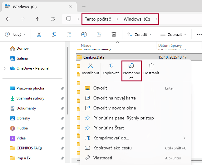 Tento priečinok premenujte (napríklad CenkrosData-záloha), poprípade ho skopírujte na iné umiestnenie.