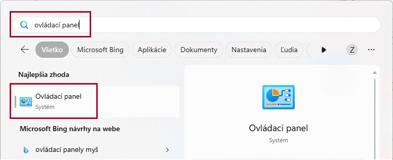 Následne cez ponuku ŠTART nájdite Ovládací panel.