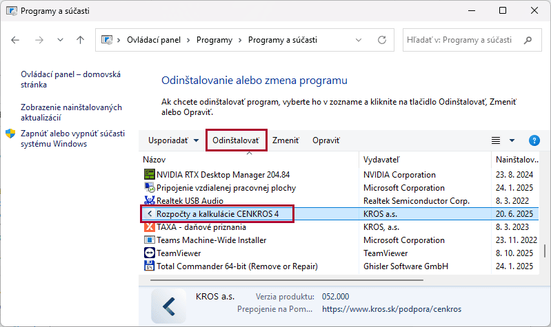 V zozname nainštalovaných programov nájdete program Rozpočty a kalkulácie CENKROS 4, postavte sa naň a zvoľte možnosť odinštalovať. Po potvrdení prebehne odinštalácia programu z Vášho počítača.