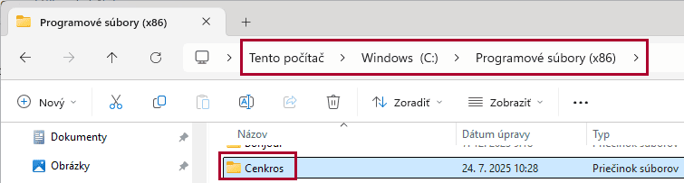 Po odinštalovaní programu odstráňte inštalačný adresár Cenkros – dostaňte sa cez ikonu Tento počítač na Disk (C:), priečinok Program Files (x86) (poprípade iba Program Files) a následne odstráňte celý adresár Cenkros.