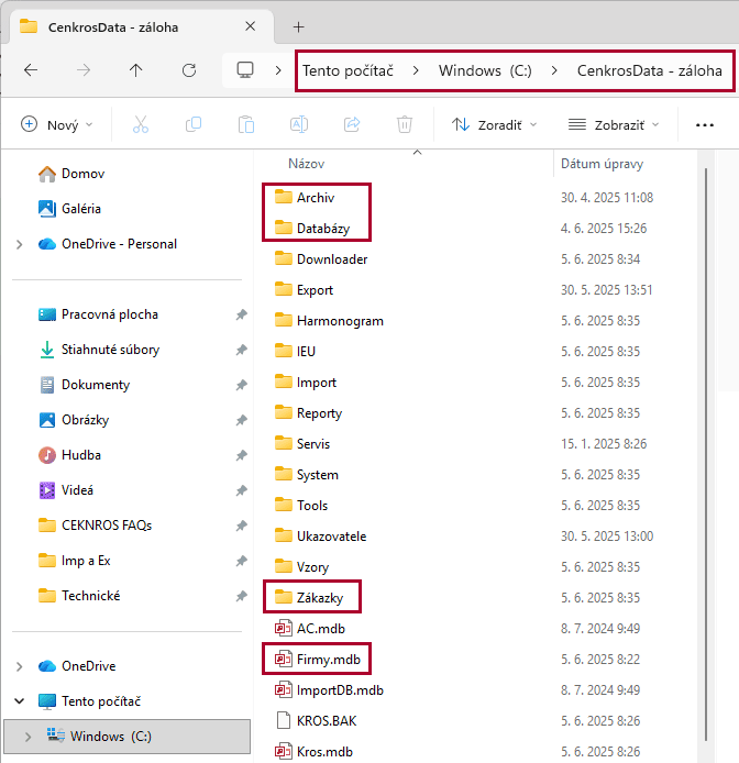 Na záver je potrebné preniesť všetky vaše dáta, aby ste mohli bezproblémovo pokračovať v práci. Do novo vytvoreného adresára CenkrosData nakopírujte súbory z Vami zálohovaného adresára. Dôležité sú obsahy priečinkov Archív, Databázy, Zákazky a súbor Firmy.mdb. (Zálohovaný adresár hneď nevymažte, ale až v prípade, ak budete mať istotu, že vám v programe nič nechýba.)