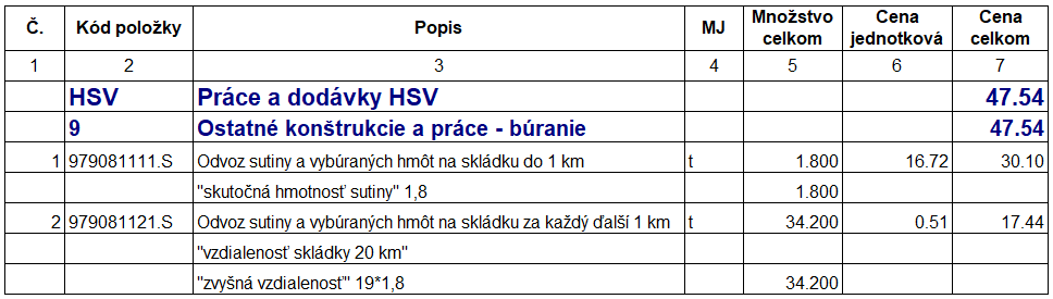 UPOZORNENIE: V zmysle poznámky k súboru cien sú v cenách započítané náklady na jazdu naloženého vozidla na skládku a aj cesta späť prázdneho vozidla na miesto nakladania sutiny.
