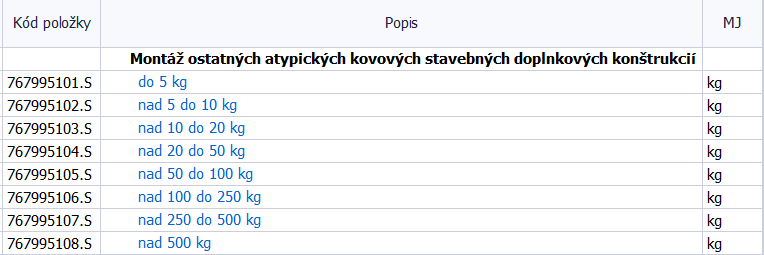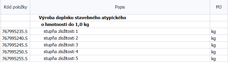 Pre zjednodušenie celého procesu výberu správnych položiek cez hmotnosti a stupne zložitosti sú v databáze k dispozícii aj adresné položky pre výrobu vybraných atypických výrobkov (767995200.S – 767995230.S). Konkrétne pre mreže, zábradlia, rebríky a schody.