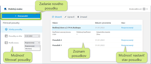 - Môžete si evidovať stav posudku – Rozpracovaný a Ukončený