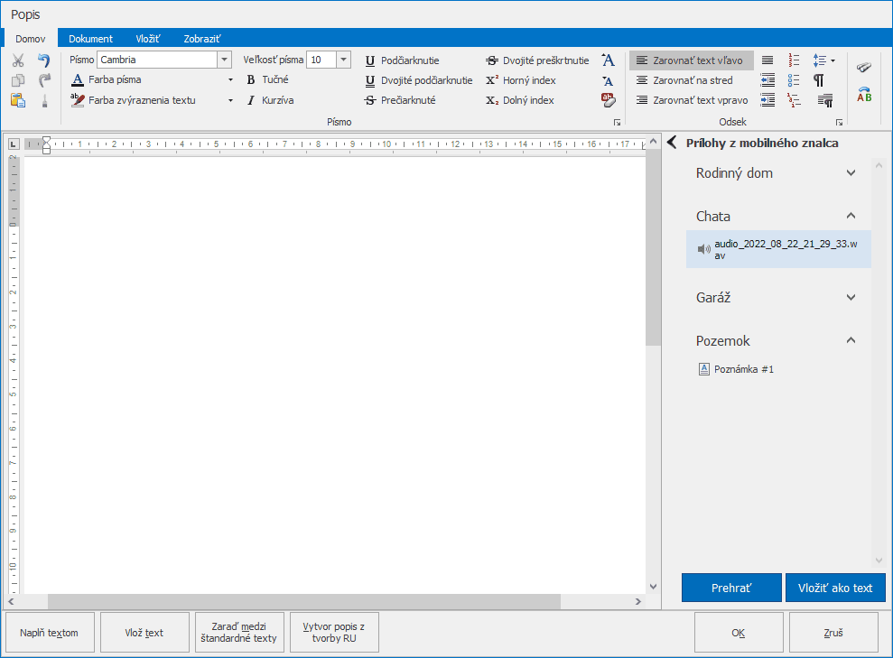Vo všetkých popisových formulároch (POPIS) nájdete bočný panel, na ktorom máte všetky prílohy z Mobilného znalca. Stačí si už len vybrať prílohu a vložiť ju do popisového poľa.