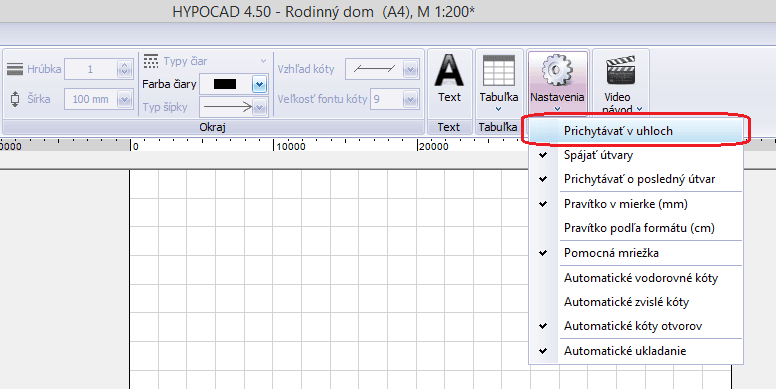 Kreslenie šikmých čiar je sprístupnené po zrušení možnosti Prichytávať v uhloch v nastaveniach programu HypoCad.