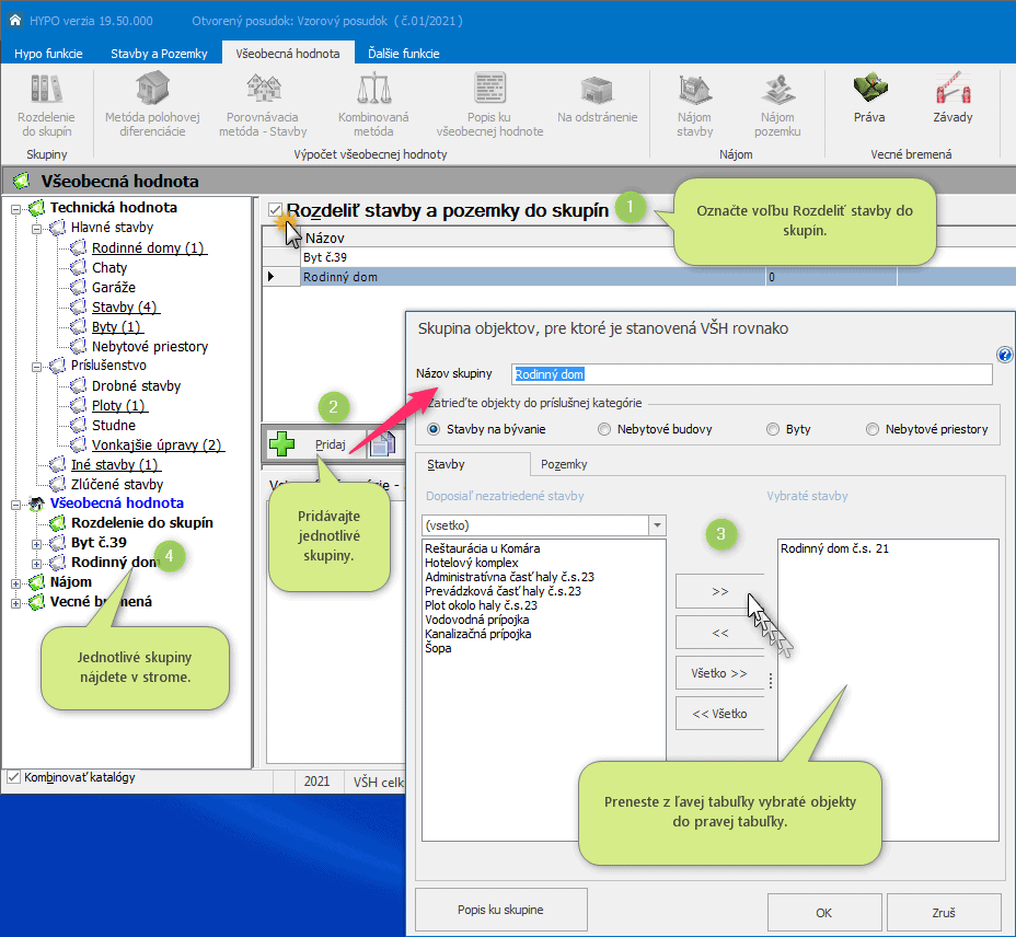 - Nad tabuľkou, ktorá sa zobrazí v pravej časti zaškrtnite box Rozdeliť stavby do skupín.