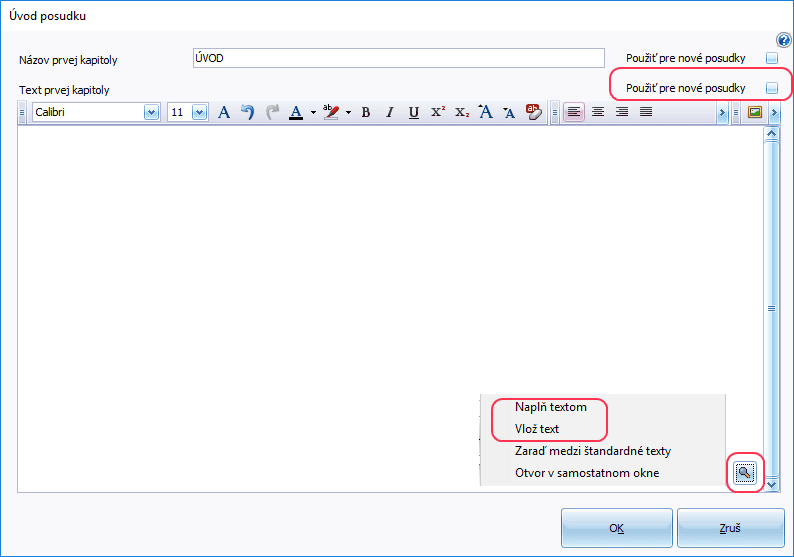 Po zaškrtnutí „Použiť pre nové posudky“ sa bude vybraný text prenášať do každého nového posudku.